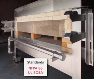 This gas fired furnace has a temperature range of 1500°F – 2450°F. Furnace is fired by high velocity burners with Honeywell UDC 2500 controllers and 7800 series flame supervision with UV scanners. Standard slot is 3” x 72”, but other configurations are available.